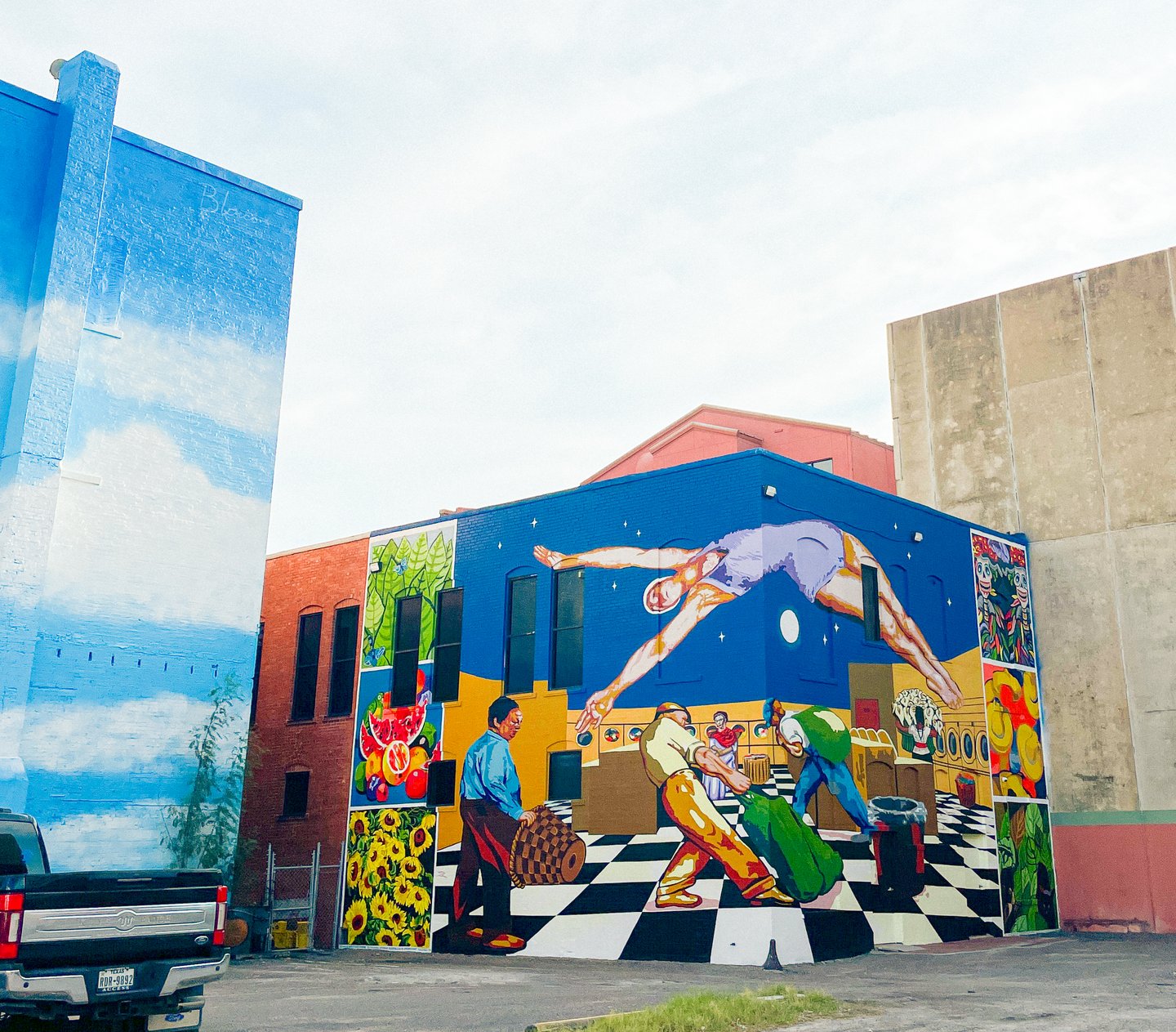 Designed by local artist Jimmy Peña and brought to life by 60 teens from K Space Contemporary’s Summer Mural Arts Program, this life-size surreal scene features famed artists Diego Rivera and Frida Kahlo doing their laundry with characters from their artwork in a washateria. View this masterpiece behind the Law Office of Scott M. Ellison at 410 Peoples St. The six-week program was led by local artists Mayra Zamora and Monica Marie Garcia with assistance from Youth Apprentices Faith Casas, Heaven Garrison, Jaylene Sanchez, and Lissandra Rodriguez.